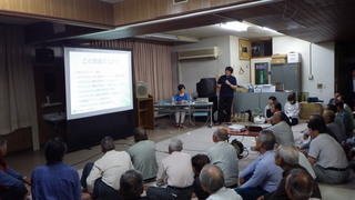 防災講演会には、区内の住民約80名が参加して熱心に聴講しました。講演会の前半では、三重大学工学研究科の川口淳 准教授から防災力診断アンケート集計結果の講評と地域の災害リスクについて説明を受けました。津波被害リスクの説明の際には、南伊勢町をモチーフにしたシ ミュレーションCG動画や東日本大震災の実映像を見ながら、想定される災害を現実的に捉える事が出来た様子でした。講演会の後半では、三重大学医学部看護 学科の磯和勅子 教授から災害時要援護者対策についての講義を受けました。