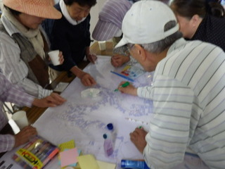 タウンウオッチングで記録した、避難時に危険な個所等を大判の地図へ書き込んでいます。