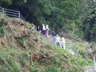 樹脂製のステップを埋め込んで整備した避難路。施工は、住民の方々が行います。手すり代わりになる、ポールとロープについても役場からの資材提供があります。
