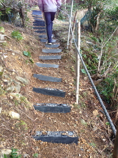 避難路の階段として利用する樹脂製のステップ。地域から区長さんを通して、避難路整備のための資材提供要望を出すと役場が素早く応える仕組みができている。