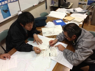 各組で前回ワークショップの図上訓練で作成した地図を基に、津波一次避難場所までの避難経路を再確認しています。