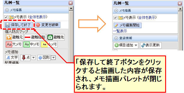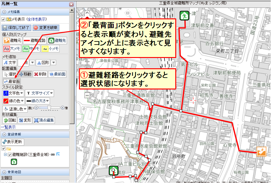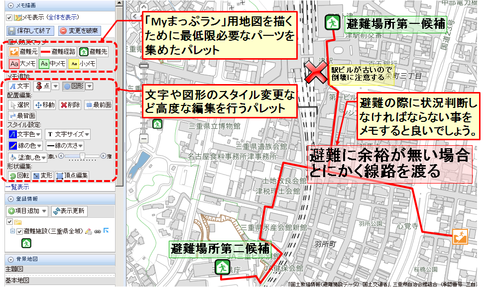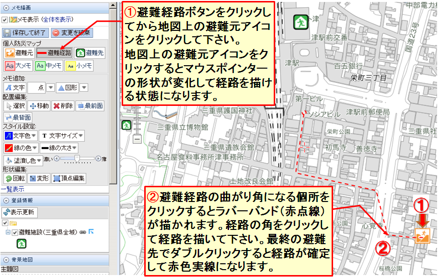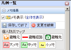 新たに開かれた地図編集画面を利用して「避難元」「避難先」「避難経路」や注意事項(メモ)などを入力して避難経路マップを作成して下さい。地図編集の操作方法は、こちら(避難経路地図作成手順)の説明を参照してください。