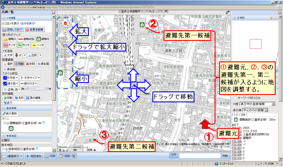 右側の「Myまっぷラン」避難経路地図作成支援ツールの地図リストでラジオボタンをクリックして背景として利用する地図を選択してください。地図選択リストにお住まいの市町の防災マップが無い場合は、最初にある「三重県全域避難所マップ」を選択してください。ただし、この「三重県全域避難所マップ」に示されている避難施設は、国道交通省が住所情報を基に位置情報を整備したモノで、地図で示された場所と実際に施設がある場所とずれている場合があるので注意が必要です。