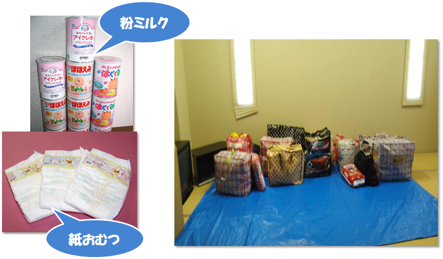 またその他の取り組みの成果としては、区の防災センターに避難袋がおけるようになったことです。 これは、まだ試験的にということで区から許可をもらって置かせていただいてます。私たちがアンケートを行ったなかで、一番心配なのが備蓄品のことです。特 に乳児の成長はとても早く、月々におむつのサイズが変わるし、ミルクや離乳食も成長に応じて変わります。避難したあとも、安心して生活ができるようにして いきたいと思っています。避難袋の備蓄品の入れ替えは年2回を基本としていますが、それ以外に希望する人はいつでも入れ替えができるようにしています。