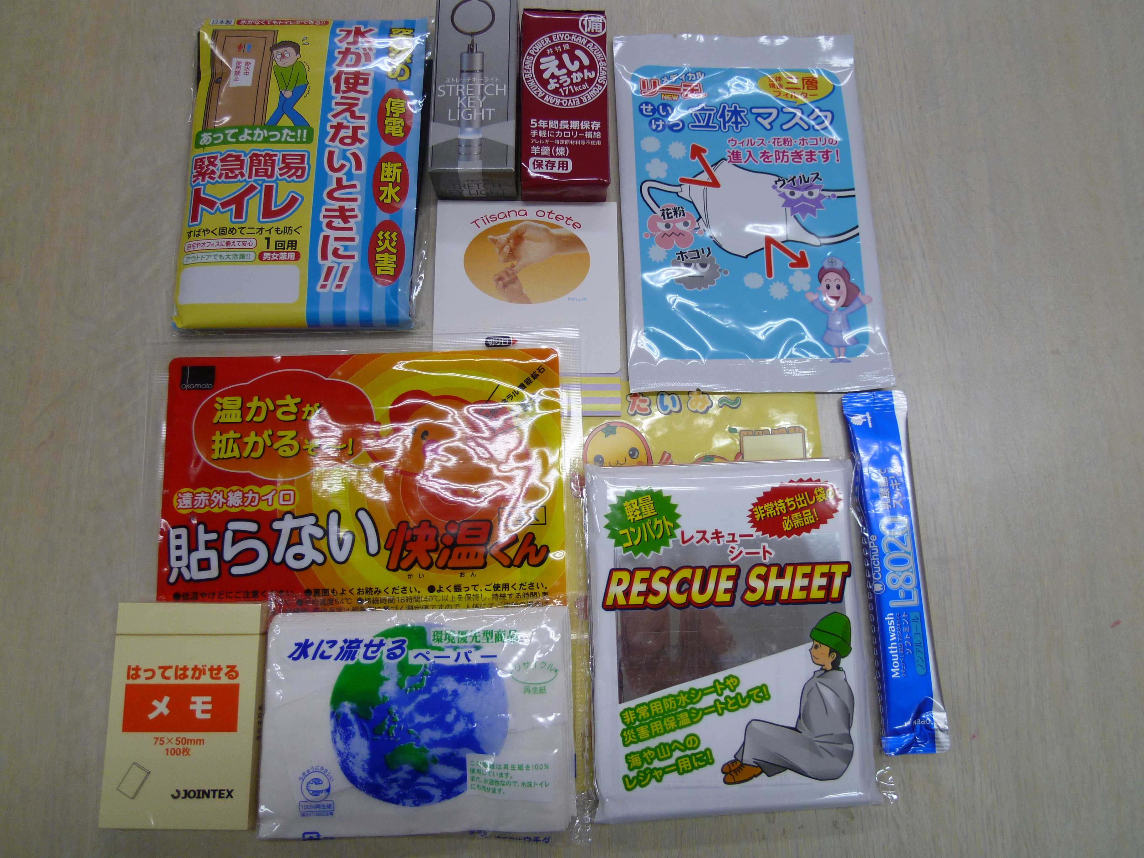 簡易トイレや、レスキューシート、栄養が入ったえいようかんなど、少しの生活に必要なものが入っています。